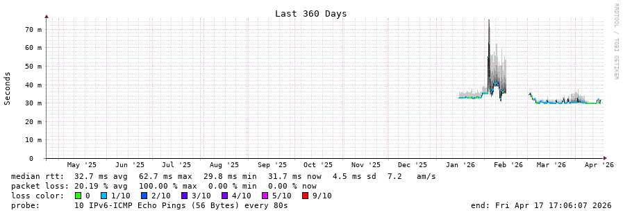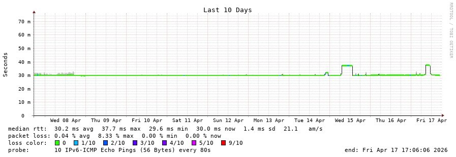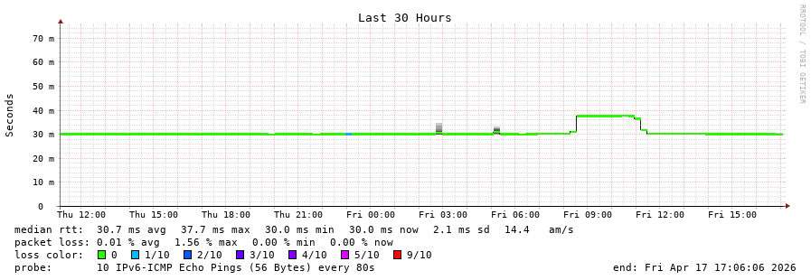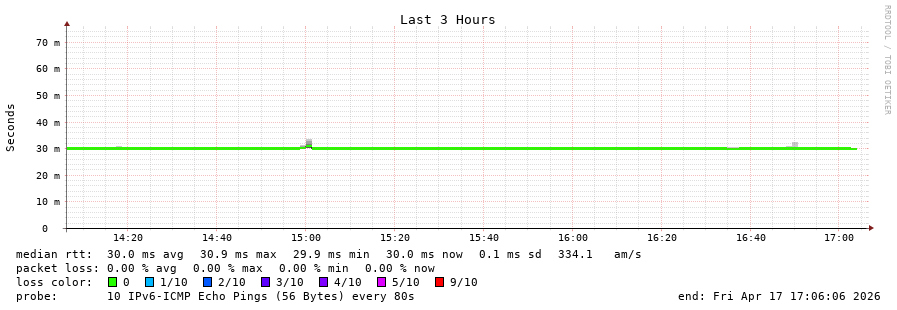 traceroute to 2a0c:9a40:8610:e3f::1 (2a0c:9a40:8610:e3f::1), 30 hops max, 80 byte packets - Generated at 2026-04-17 17:00:01