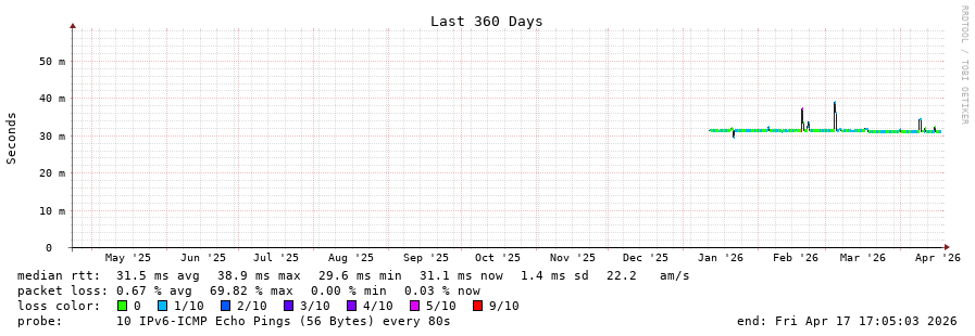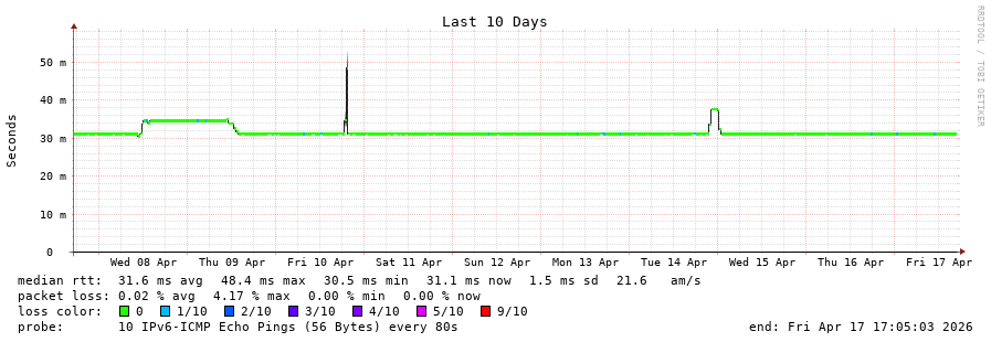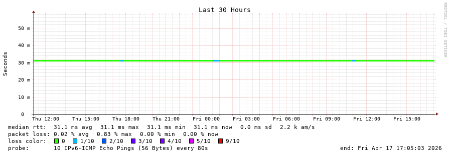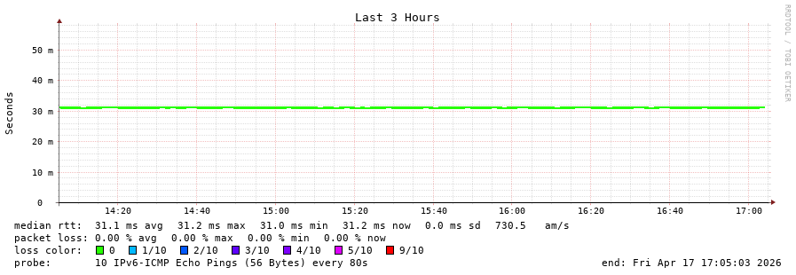 traceroute to 2a00:c30:bbbb:d::2 (2a00:c30:bbbb:d::2), 30 hops max, 80 byte packets - Generated at 2026-04-17 17:00:01